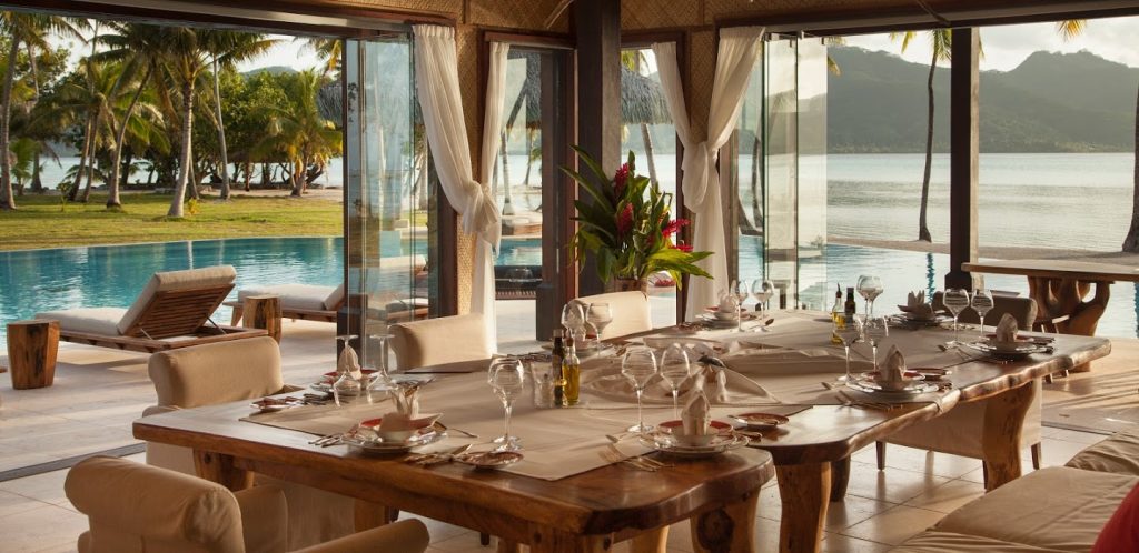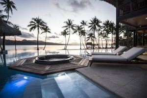 L’architecture de la villa invite l’extérieur à entrer : les espaces de vie ouverts s’articulent autour d’une piscine paisible, tandis que de larges baies vitrées offrent une vue panoramique sur les silhouettes de Huahine, Raiatea et Taha’a.